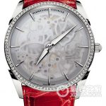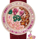 Basic Information ID: VCARO4JV00 Brand: Van Cleef & Arpels Series: Exceptional Dial Movement Type: Quartz Gender: Ladies Movement Type: Quartz Appearance: Case Diameter: 32mm Case Thickness: Not Available Dial Color: Patterned Dial Shape: Round Strap Color: Pink, Purple (Two straps available) Clasp Type: Pin Buckle Case Back: Solid Case Back Weight: Not Available Water Resistance: 30 Meters Hour Marker Type: None Hour Marker Spacing: Not Available Lug Spacing: Not Available Materials Case Material: 18k White Gold Dial Material: Light-colored mother-of-pearl dial decorated with miniature painted leaves, miniature painted lilacs, engraved mother-of-pearl miniature patterns set with pink sapphires and amethysts, background decorated with engraved mother-of-pearl miniature saffron, foreground decorated with white gold saffron, yellow gold pistil decoration Cabochon Enamel Bezel Material: 18k White Gold, set with gradient pink sapphires, purple sapphires and round diamonds Crystal Material: Sapphire Crystal Glass Crown Material: 18k White Gold, set with round diamonds Strap Material: Alligator Leather Buckle Material: 18k White Gold Functions: This watch has no other special functions.