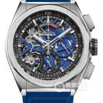 Basic Information Number 95.9002.9004/78.R584 Brand Zenith Series Peak Movement Type Automatic Gender Men’s Movement Movement Model El Primero 9004 Movement Type Automatic Manufacturer Zenith Frequency One escapement mechanism for timekeeping (36,000 vibrations per hour, i.e., 5 Hz) An escapement mechanism for timing (360,000 oscillations per hour, or 50 Hz) Number of parts per hour: 293 Power reserve: 50 hours Technical certification: Swiss Official Chronometer Testing Institute (COSC) Appearance: Case diameter: 44 mm Case thickness: Not available Dial color: Skeletonized Dial shape: Round Strap color: Dark blue Clasp type: Double folding clasp Case back: Transparent Weight: Not available Water resistance: 100 meters Hour markers: Bat markers Luminous Clasp spacing: Not available Lug spacing: Not available Materials: Case material: Brushed titanium Dial material: Skeletonized dial with two-tone chronograph subdials Bezel material: Brushed titanium Crystal material: Sapphire crystal Crown material: Brushed titanium Strap material: Alligator leather-rubber Clasp material: Titanium Functions: Chronograph, Power reserve display