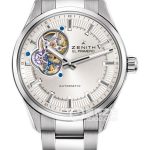 Basic Information Number: 18.1970.681/01.C725 Brand: Zenith Series: STAR Movement Type: Automatic Mechanical Gender: Women’s Movement Model: Elite 681 Movement Type: Automatic Mechanical Manufacturer: Zenith Movement Diameter: 25.6 mm Movement Thickness: 3.81 mm Frequency: 28,800 Hz Automatic Hairspring Compensation Flat Hairspring Shock Absorber: KIF Jewels: 27; Parts: 128; Power Reserve: 50 hours; Dimensions: Case Diameter: 33mm; Case Thickness: 9.45mm; Dial Color: Silver-white; Dial Shape: Round; Strap Color: Dark Brown; Buckle Type: Pin Buckle; Case Back: Transparent; Weight: Not available; Water Resistance: 30 meters; Hour Markers: Roman numerals; Buckle Spacing: Not available; Lug Spacing: Not available; Materials: Case Material: 18k Rose Gold; Dial Material: Engraved with “porcelain enamel effect,” gold-plated Roman numeral hour markers; Bezel Material: Not available; Crystal Material: Domed double-sided anti-reflective sapphire crystal; Crown Material: 18k Rose Gold; Strap Material: Alligator leather with protective rubber base; Buckle Material: 18k Rose Gold; Functions: This watch has no other special functions.