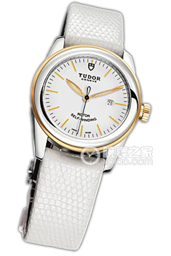 Tudor Grandeur 53003 - White dial, gold bezel, and white lizard leather strap Automatic machinery, stainless steel, 31mm