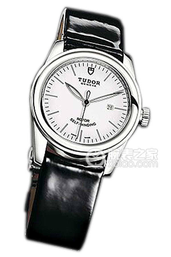 Tudor Grandeur 53000: White dial, stainless steel bezel, black patent leather strap Automatic machinery, stainless steel, 31mm