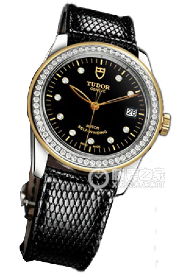 Tudor Grandeur 55023 - Black dial with diamond-encrusted gold bezel and black lizard leather strap Automatic machinery, stainless steel, 36mm