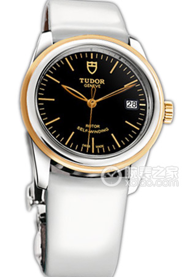 Tudor Grandeur 55003: Black dial, gold bezel, white patent leather strap Automatic machinery, stainless steel, 36mm