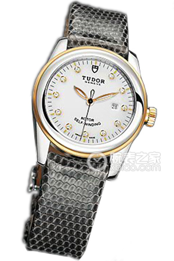 Tudor Jaguar 53003 - White dial with diamonds, gold bezel, and grey lizard skin trim Automatic machinery, stainless steel, 31mm