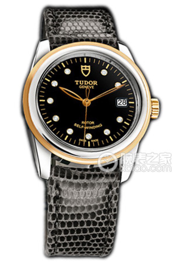 Tudor Grandeur 55003 Black Dial with Diamonds, Gold Bezel, and Grey Lizard Leather Strap Automatic machinery, stainless steel, 36mm