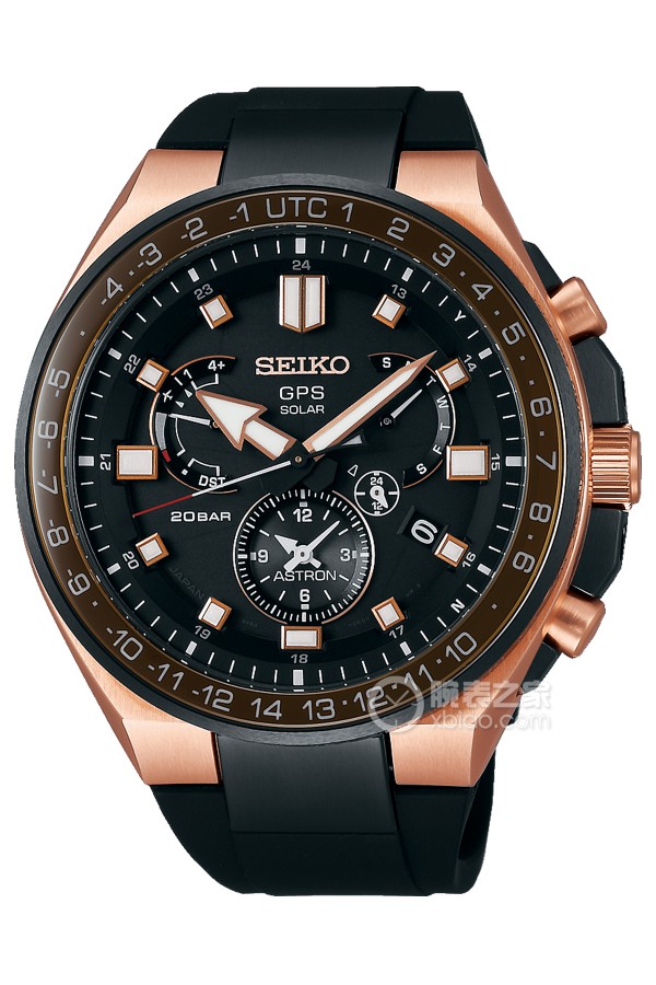 Seiko ASTRONSAS032J1 Solar-powered, stainless steel case and bezel plated with rose gold.